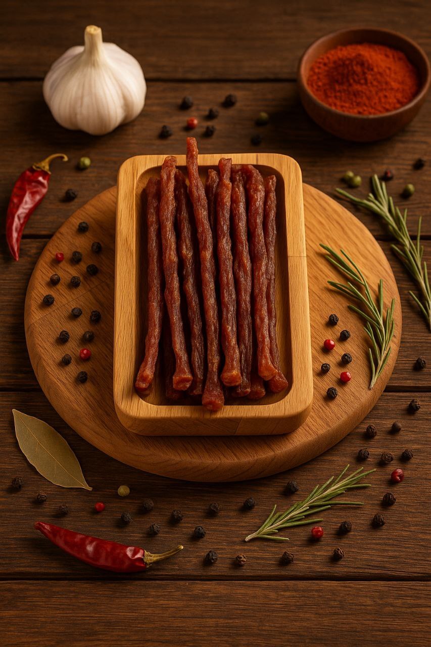 Натуральная, пряная и ароматная — тонкие полоски сушеного мяса из сочной индейки с лёгким дымком.