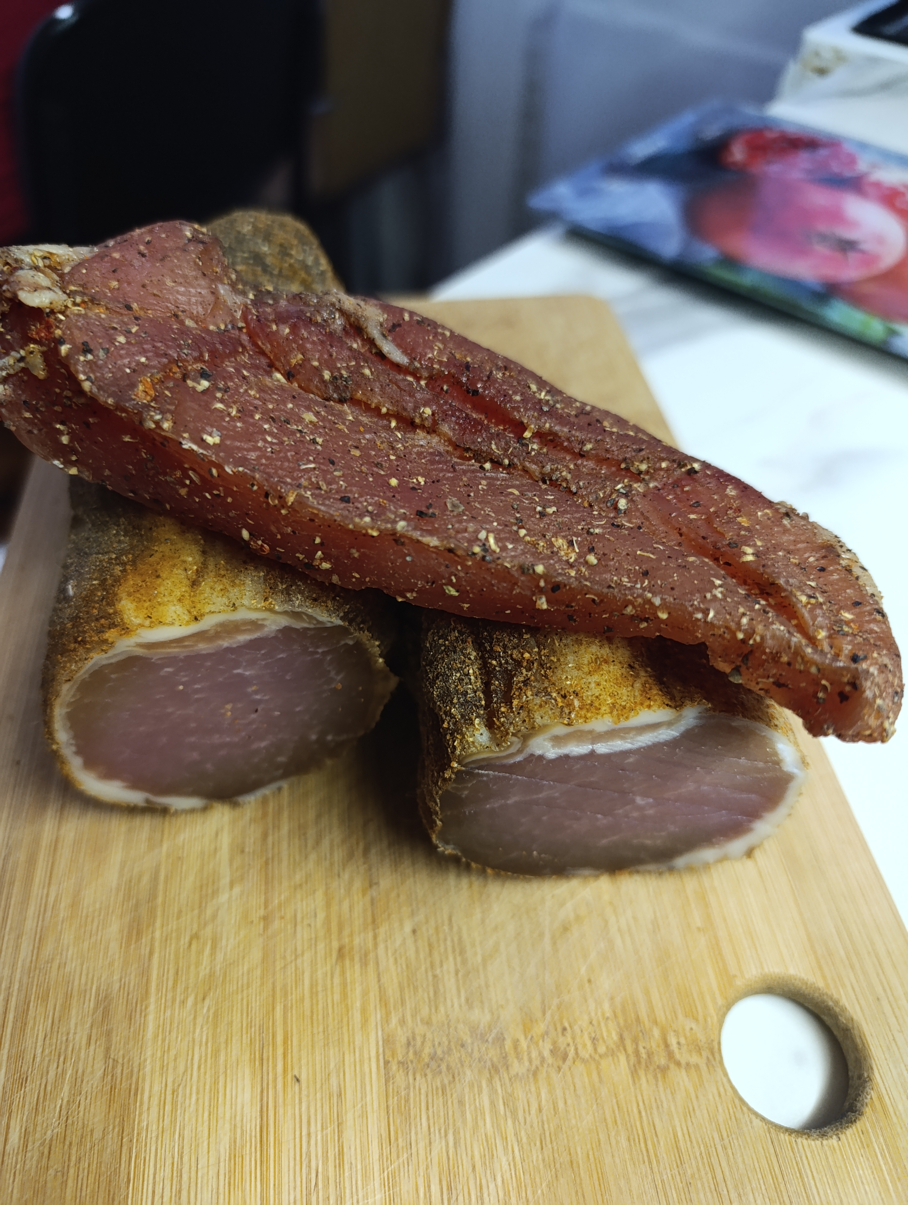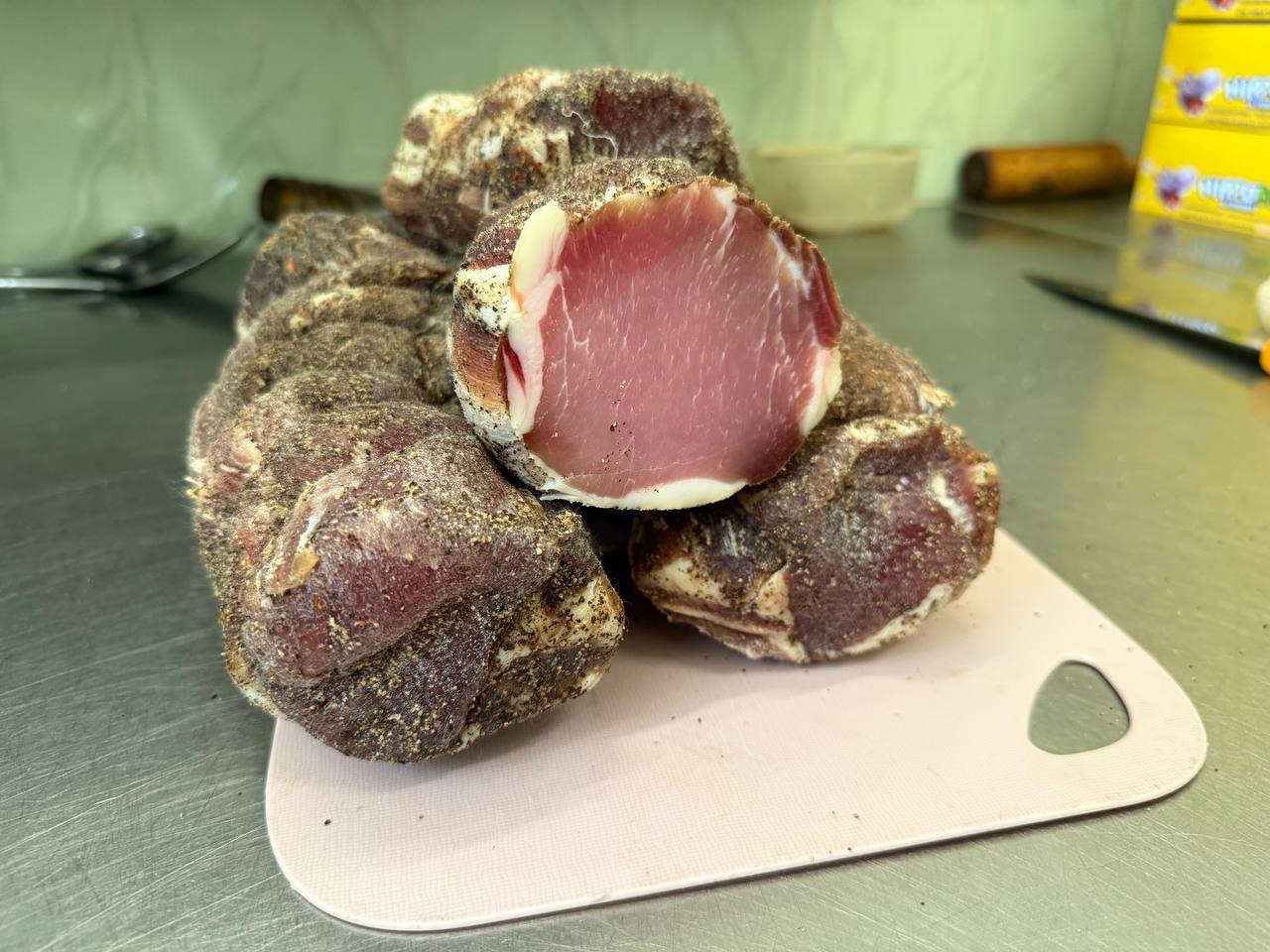 Отборный свиной карбонат, выдержанный в специях и бережно вяленый до идеального состояния. Нежная текстура, насыщенный мясной вкус и пряный аромат без лишних добавок — только мясо, соль и натуральные специи.